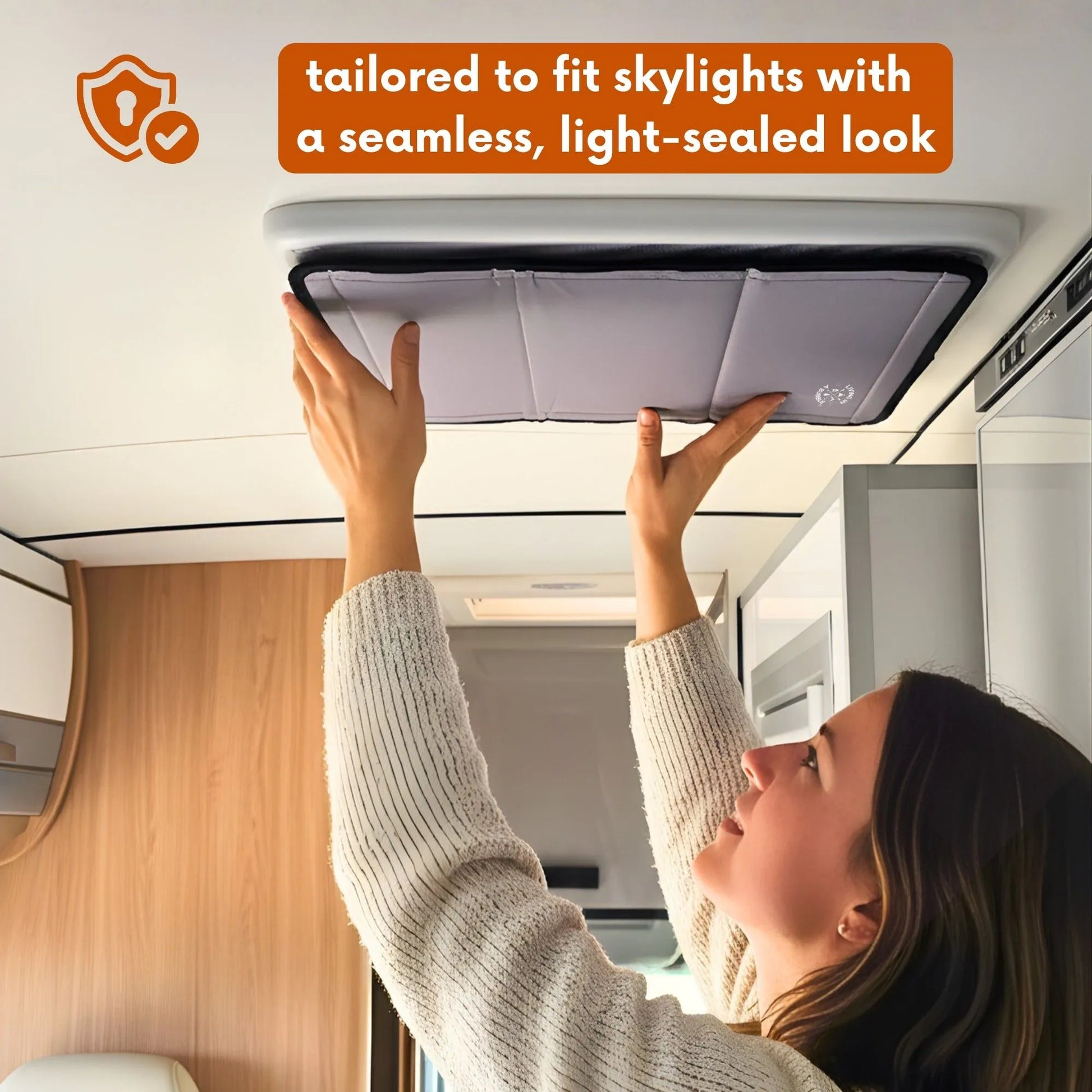 Sleep better inside your home-on-wheels with Living in a Bubble insulated blackout skylight cover, designed for complete light control. No more unwanted morning light!