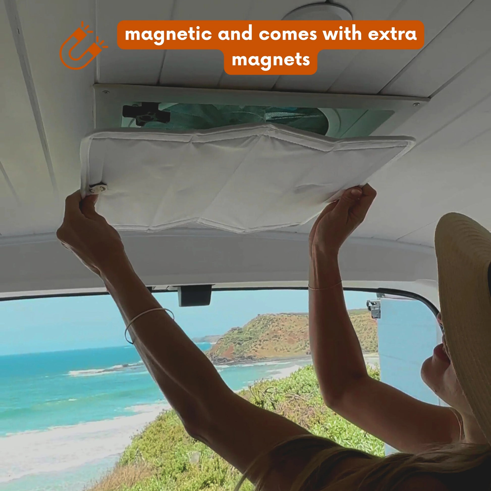 Easily attach and detach this magnetic slip-on, insulated vent fan cover to instantly improve the look, temperature, and sleep in your van. It is a must-have van camping and conversion kit accessory for your next adventure!
