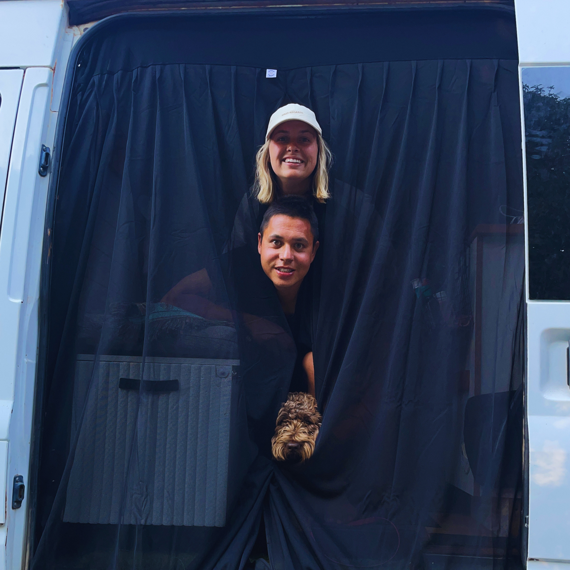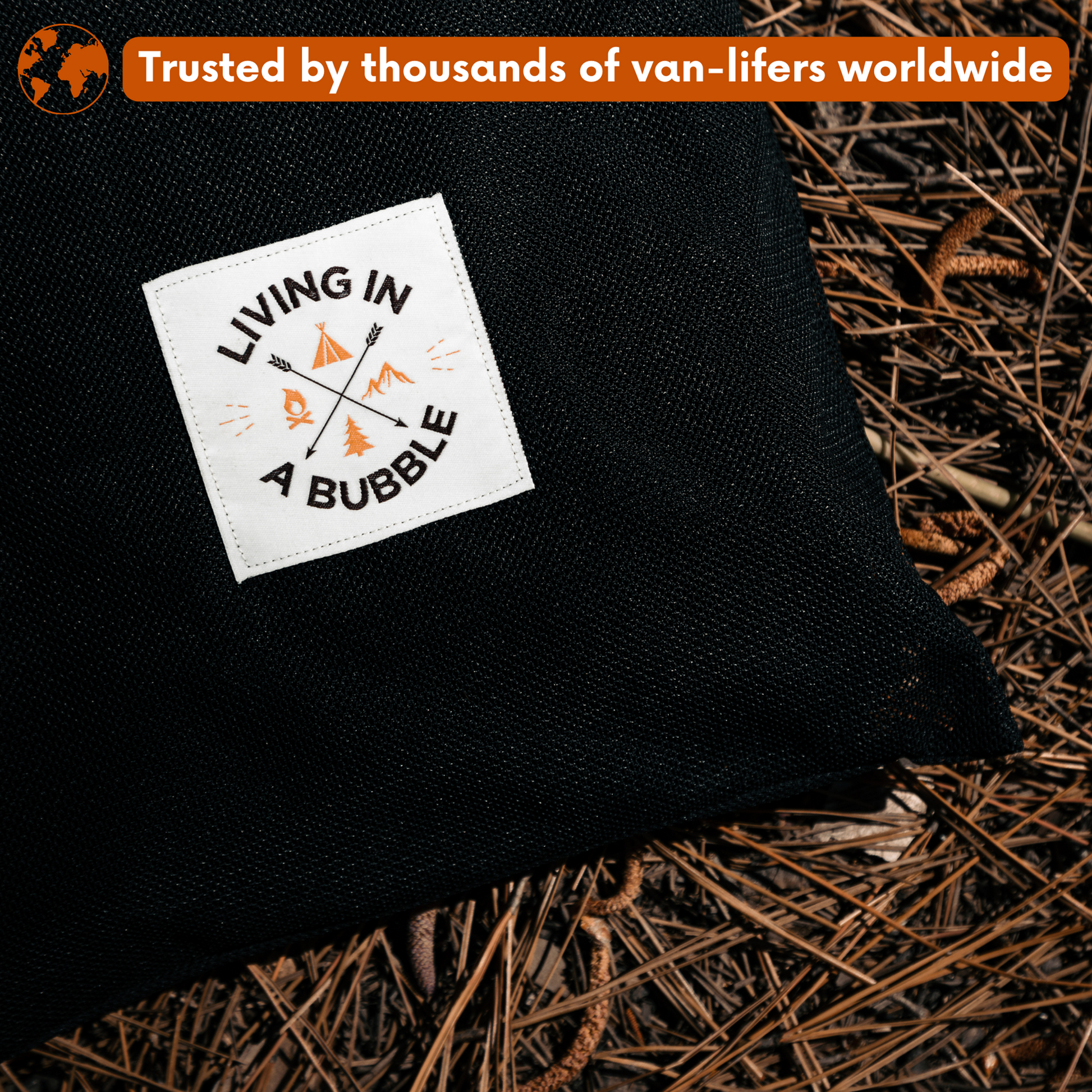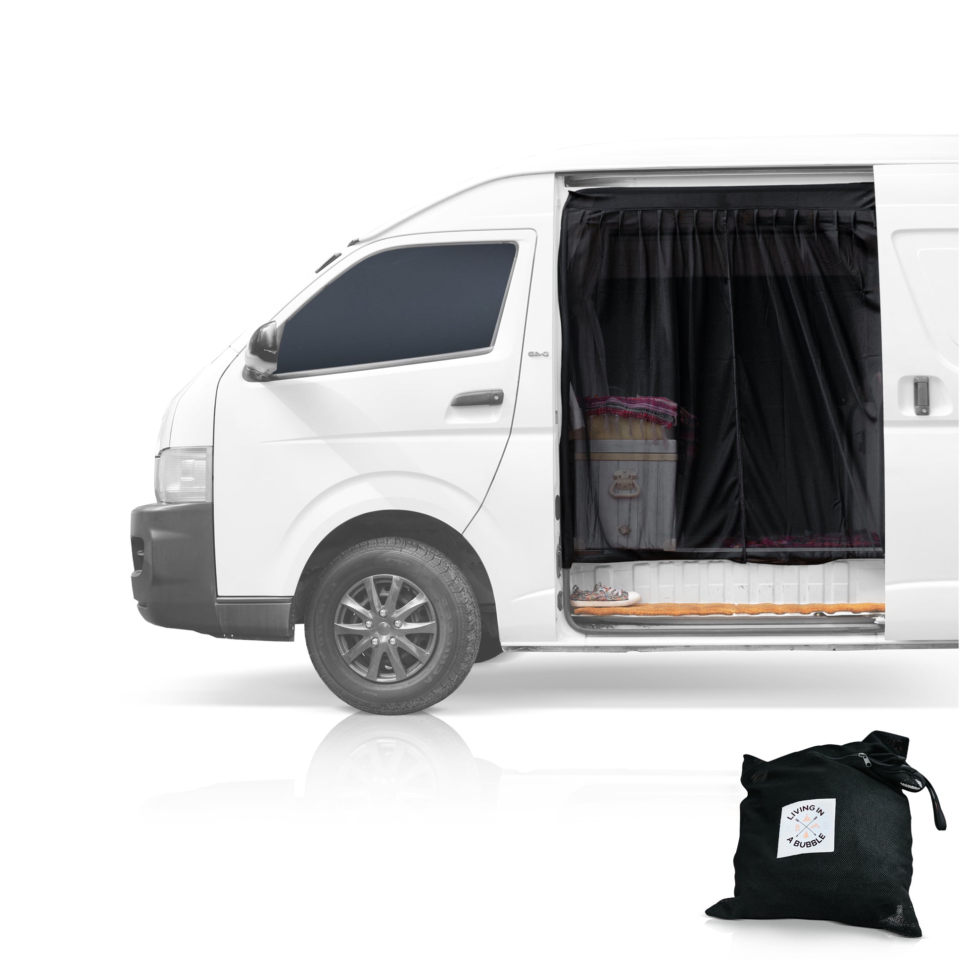 Easy self-install magnetic fly screen for side door with a center opening that closes with magnets, making it easy to enter and exit the van while keeping insects out.