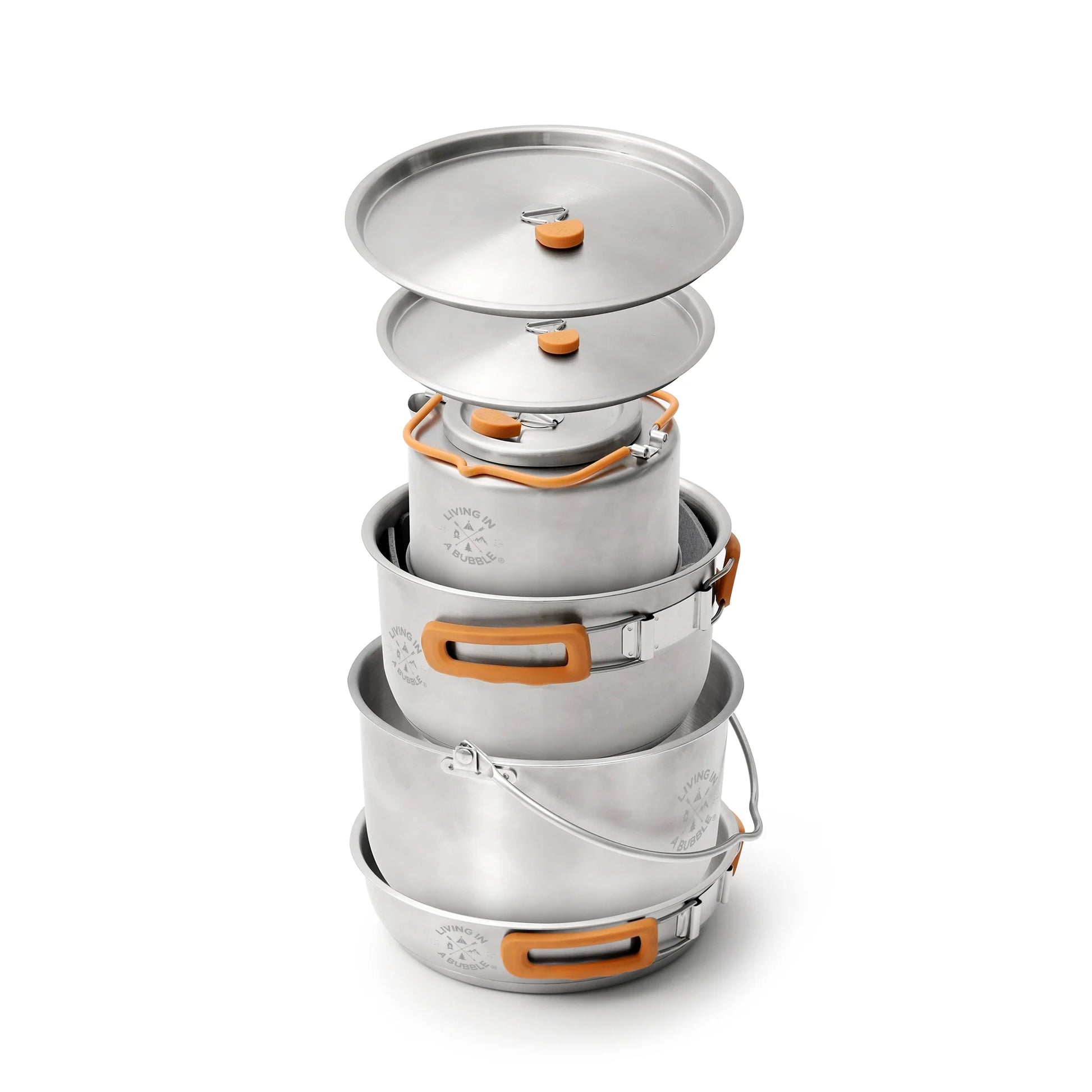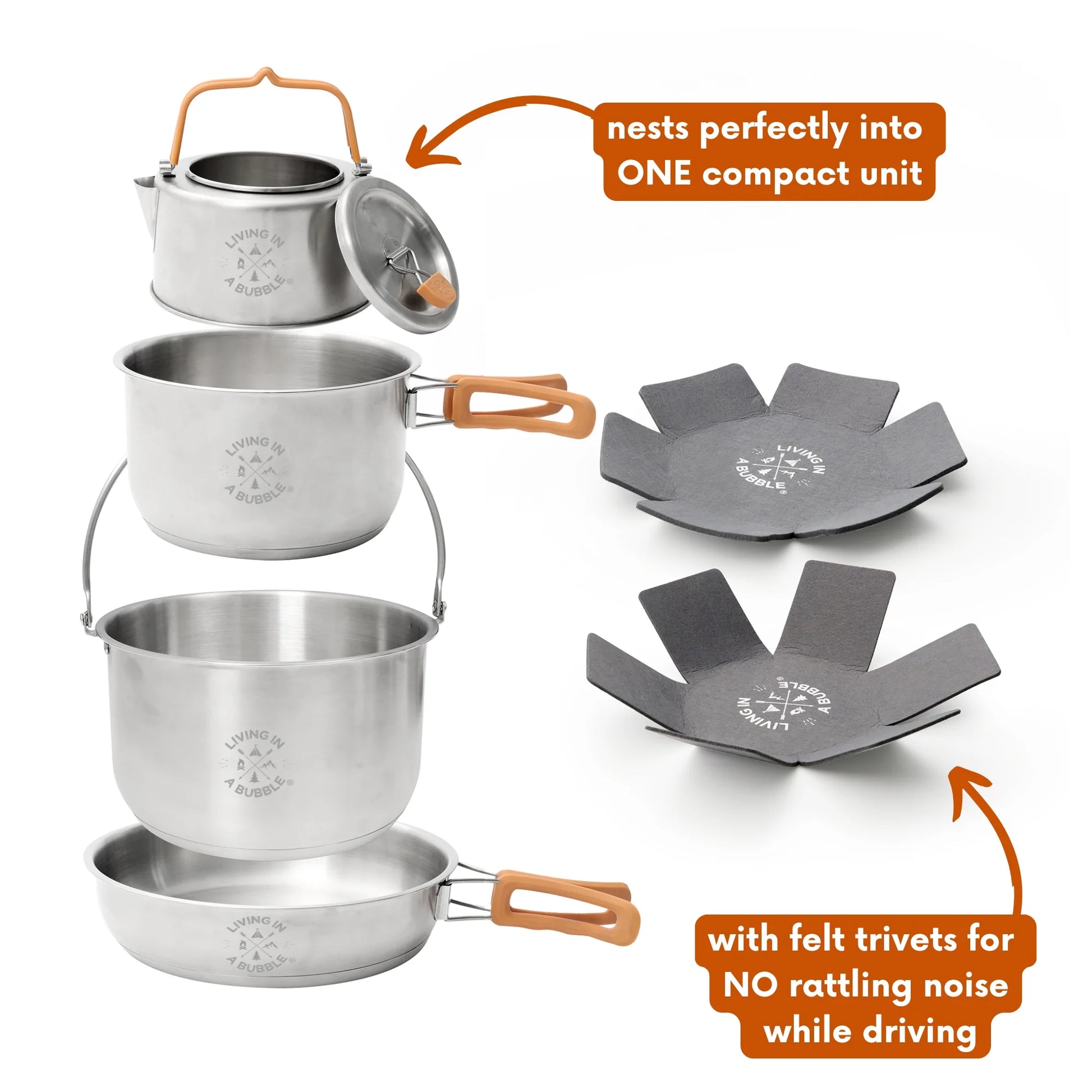 Your adventure shouldn't come with cooking compromises. Don't let limited space, clanging pots, and unreliable cookware derail your meals. The Living In A Bubble Premium 7-Piece Cooking Set is your ultimate solution for hassle-free cooking, designed specifically for the unique demands of outdoor life, packing premium quality and clever features into a perfectly compact system.