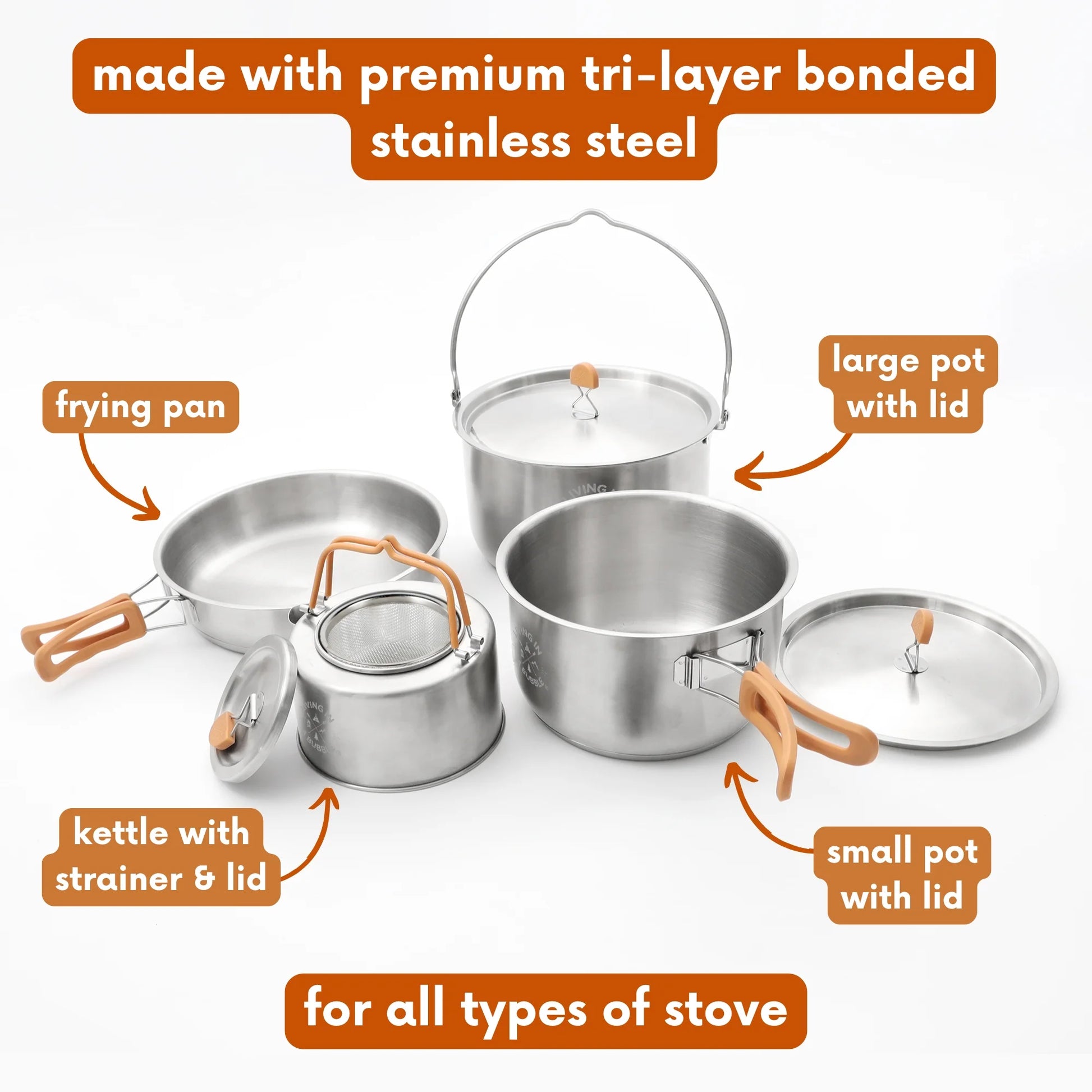 Crafted with tri-layer stainless steel for even heat distribution, our pots and pan are adventure-proof. Cook confidently on gas stoves, wood fires, electric, or induction cooktops. With sturdy, comfort-grip handles and an integrated kettle strainer, this is dependable cookware built for real outdoor use—no gimmicks, just pure performance.