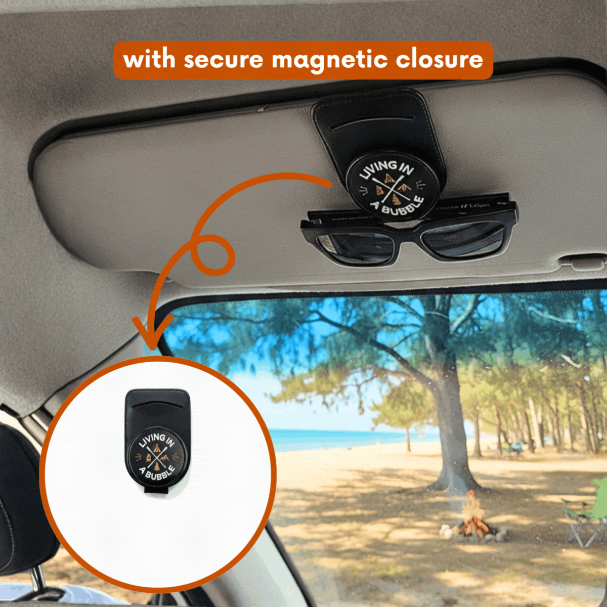 Keep your sunglasses safe, scratch-free, and always within reach. This sunglasses holder features a strong magnetic closure and a soft protective lining to keep your eyewear secure and scratch-free. The holder easily attaches to your sun visor with a universal clip, making it a simple, quick storage solution for everyday driving and outdoor adventures.